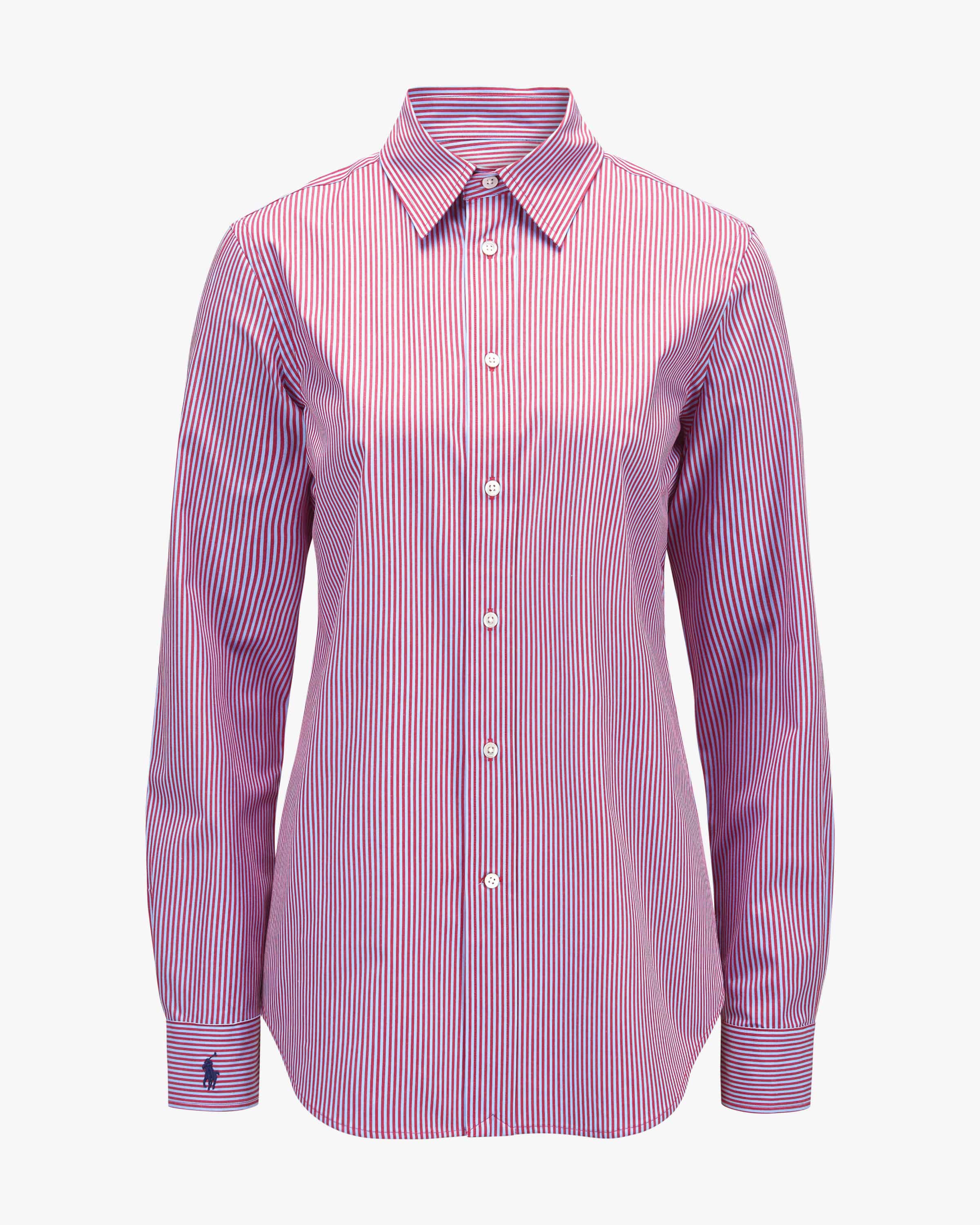 Hemdbluse für Damen von Polo Ralph Lauren in Rot und Hellblau. Das gestreifte Modell erhält durch die charakteristische Logo-Stickerei einen labeltypischen Charakter, während die Perlmuttknöpfe den Gesamt-Look elegant abrunden. Die schmale Silhouette mit Stretch-Anteil sorgt zugleich für einen perfekten Sitz.