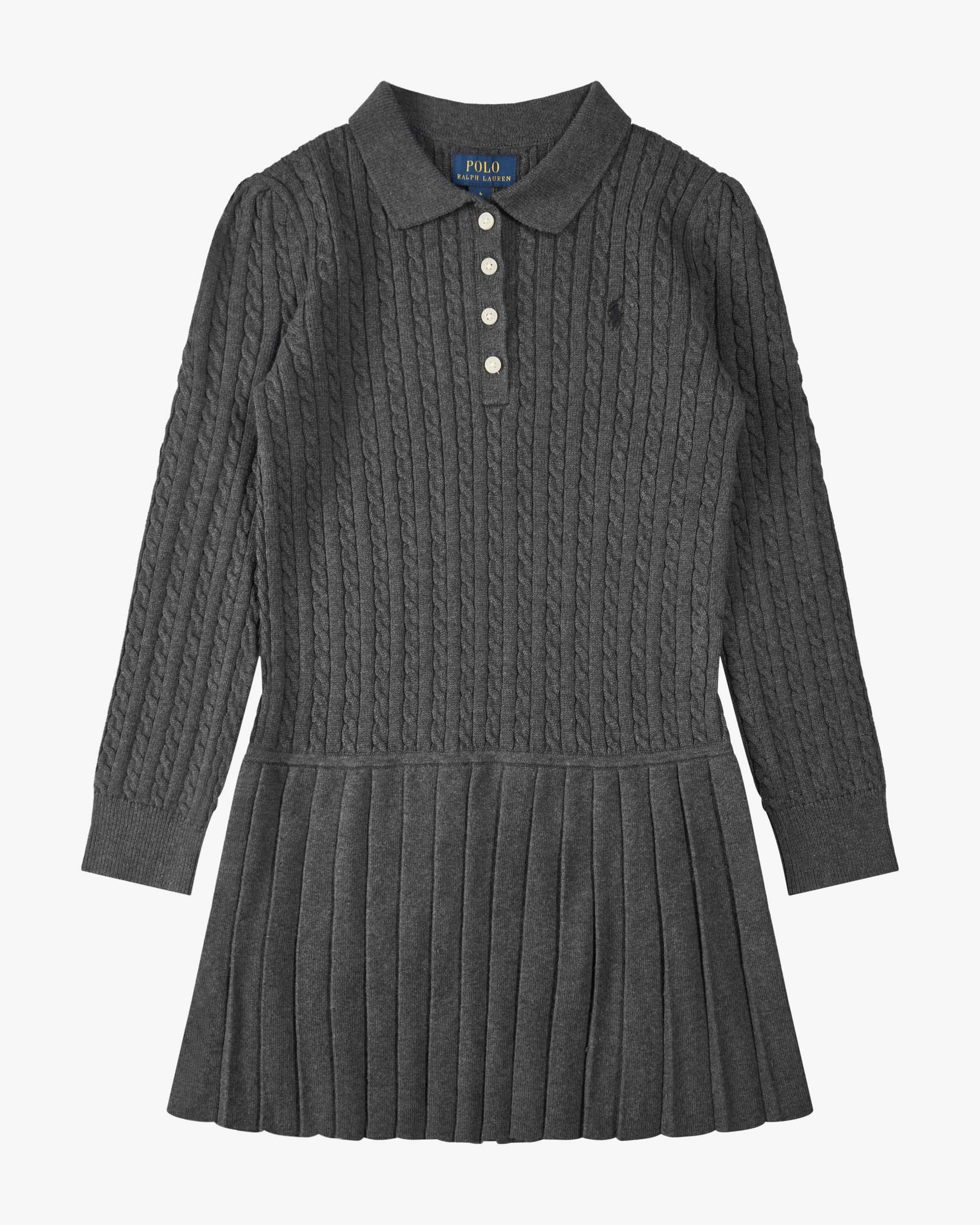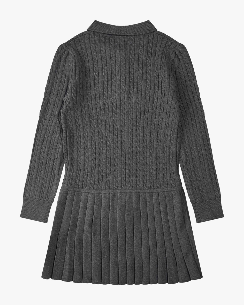 Strickkleid für Mädchen von Polo Ralph Lauren in Anthrazit. Das Modell präsentiert sich mit feinem Zopfstrickmuster, während der angesetzte Faltenrock den 2-in-1 Style gekonnt in Szene setzt. Der hochwertige Materialmix garantiert angenehmen Tragekomfort und rundet den klassische-sportiven Look harmonisch ab.
