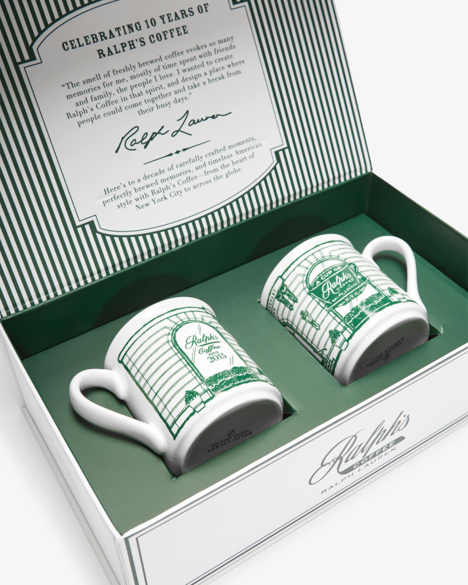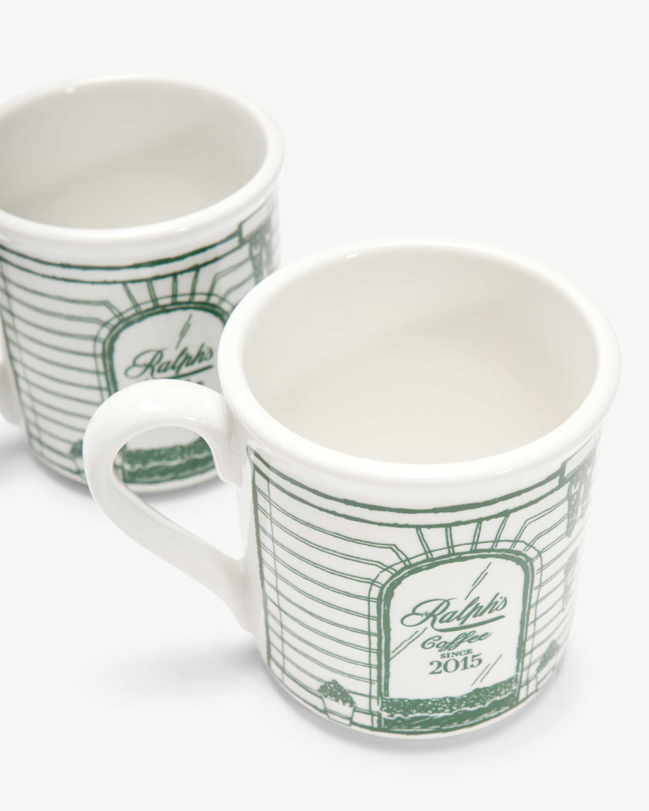 Ralph’s Coffee Tassen-Set von Polo Ralph Lauren in Weiß und Grün. Mit diesem Set feiert Ralph’s Coffee sein 10-jähriges Jubiläum. Die Tassen präsentieren sich dank des schlichten Designs mit dem stilisierten Motiv als modische Essentials für Kaffeeliebhaber. Klassische Logo-Details runden das Gesamtbild harmonisch ab.