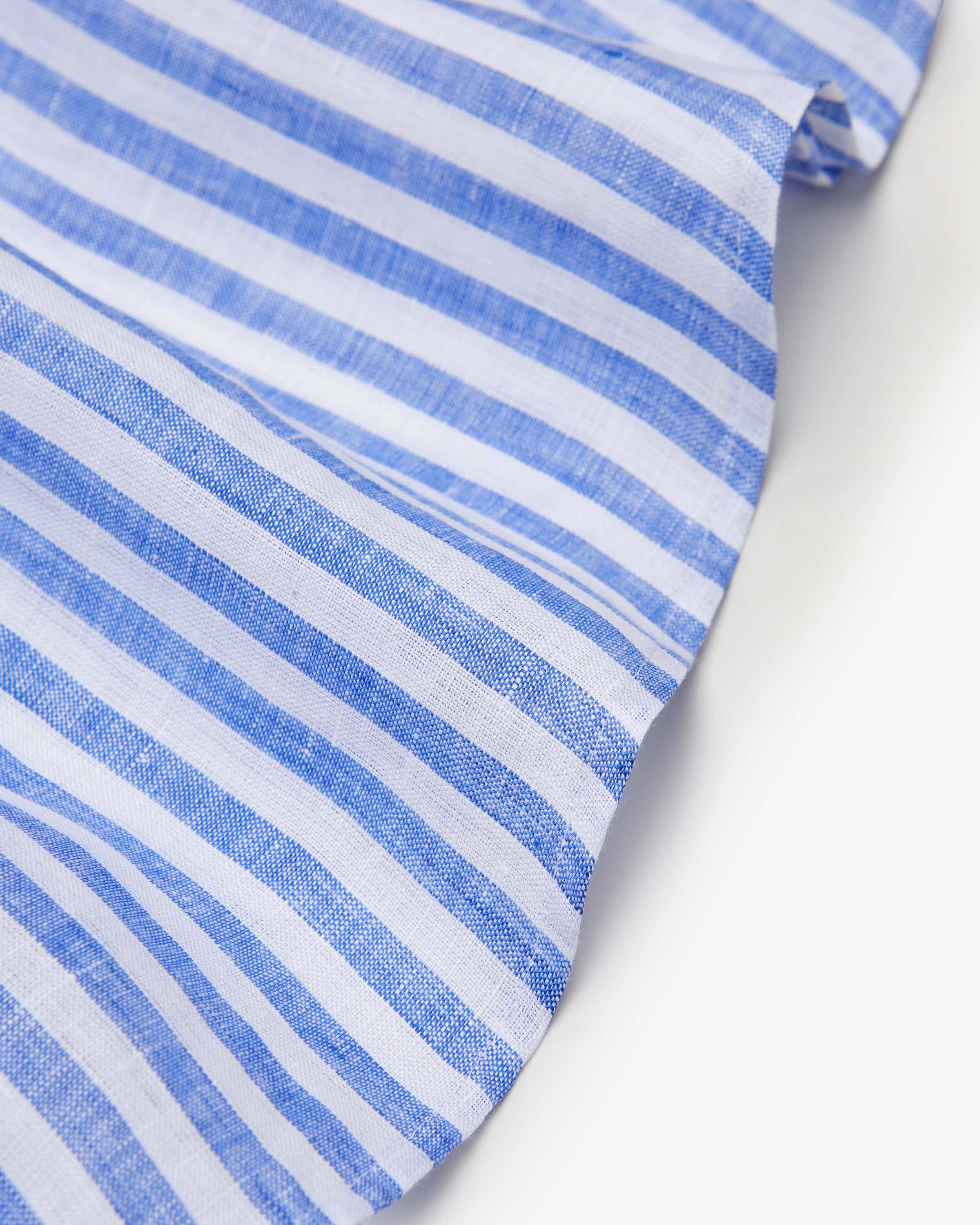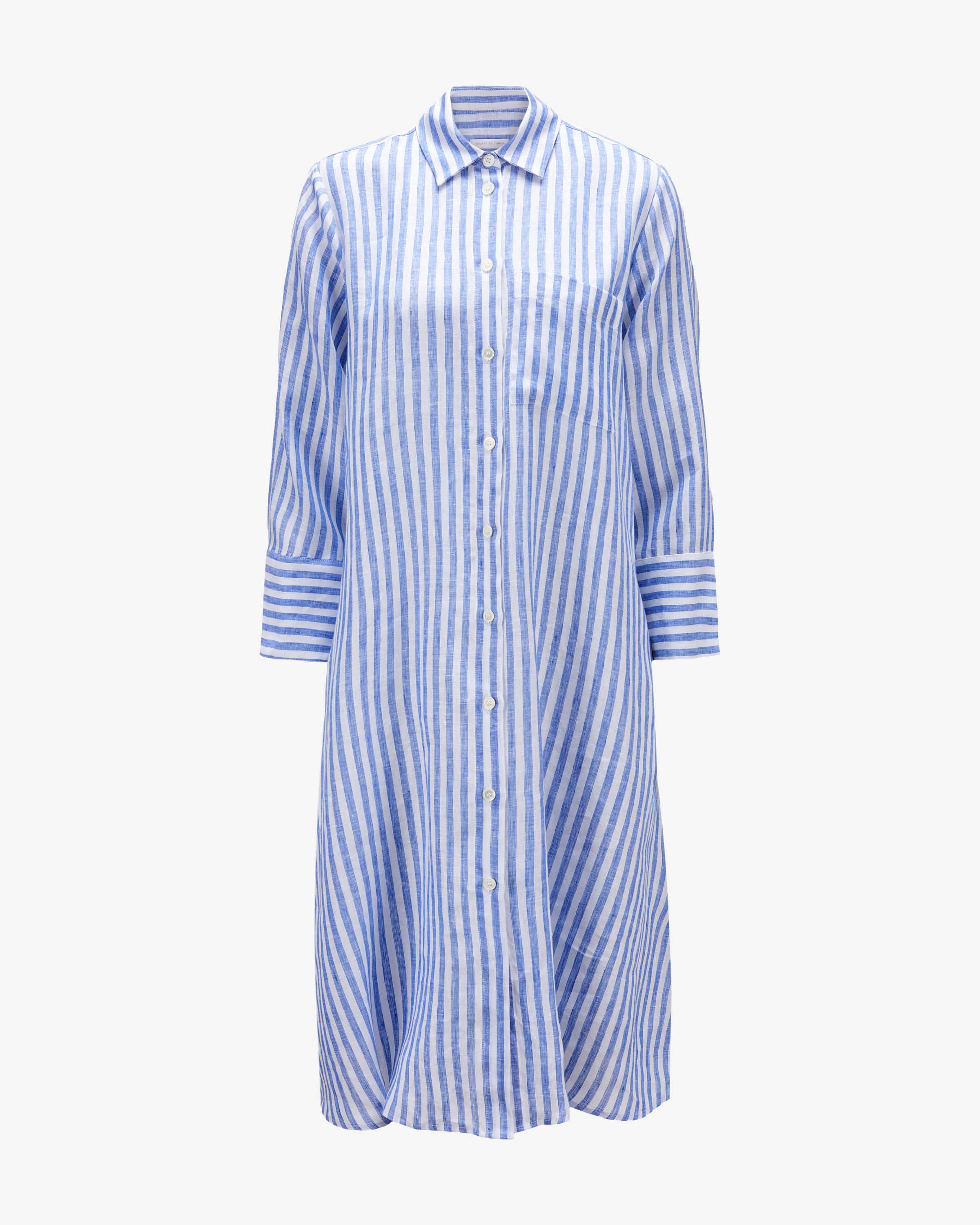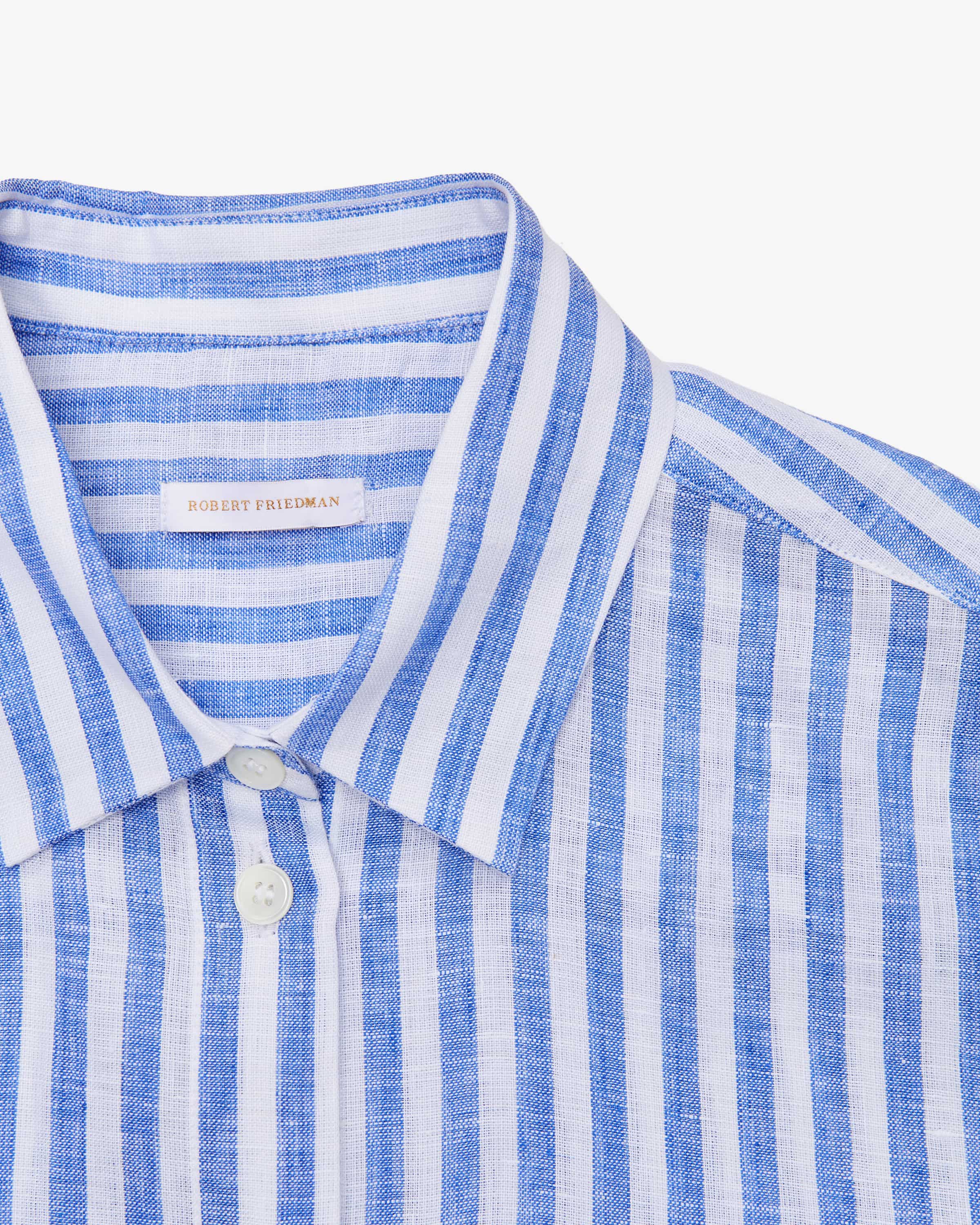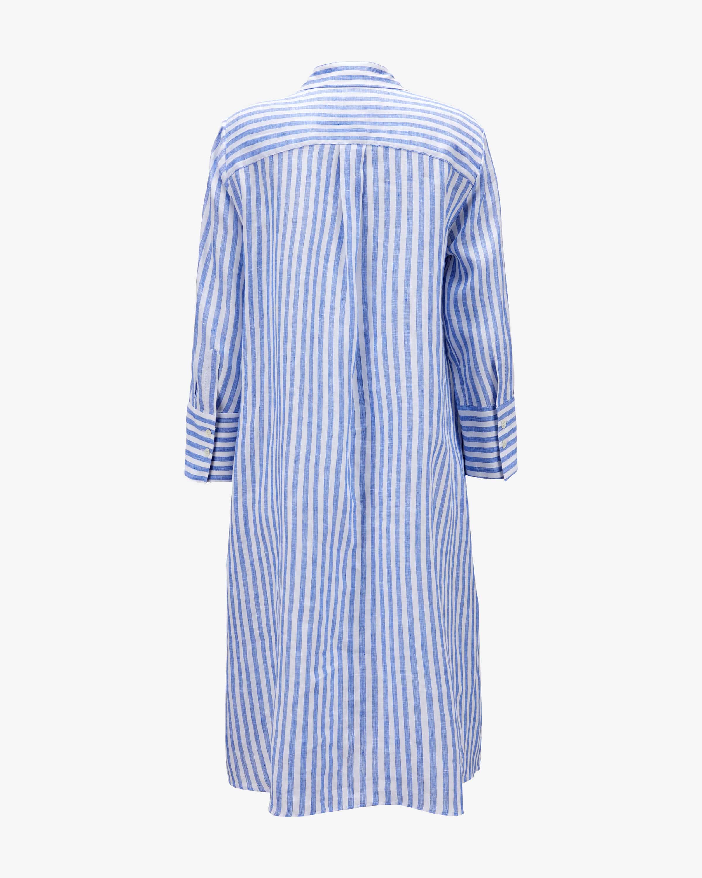 Leinen-Hemdblusenkleid Lena für Damen von Robert Friedman in Blau und Weiß. Steht für hochwertige Blusen und Hemden – italienische Stoffe, deutsche Passform, internationale Klasse. Gefertigt aus hochwertiger Leinen-Qualität, überzeugt das weit geschnittene Modell mit seiner leichten wie auch kühlenden Eigenschaft. Changierende Knöpfe setzen zudem stilvolle Akzente und schaffen einen zeitlos-modernen Sommer-Begleiter.