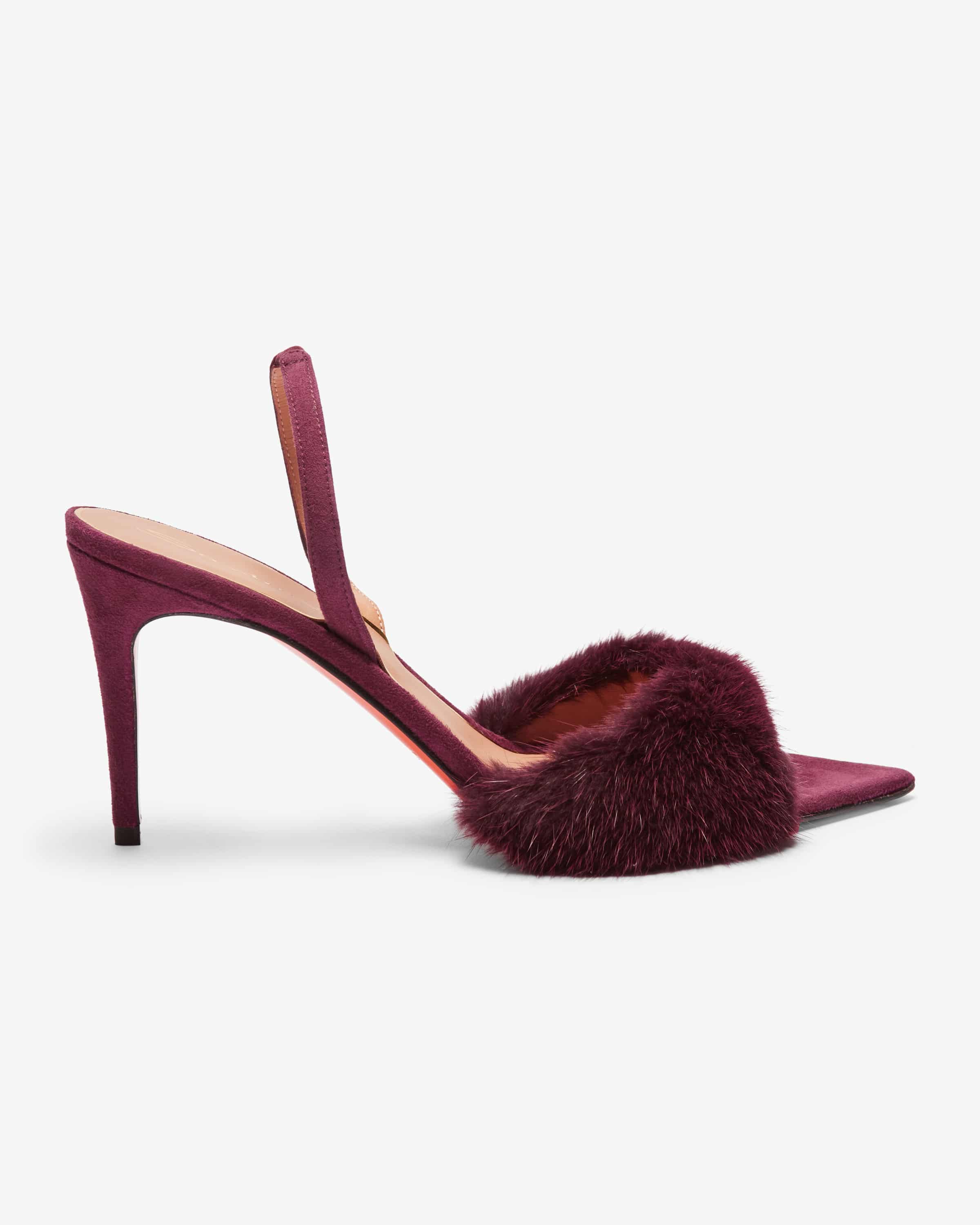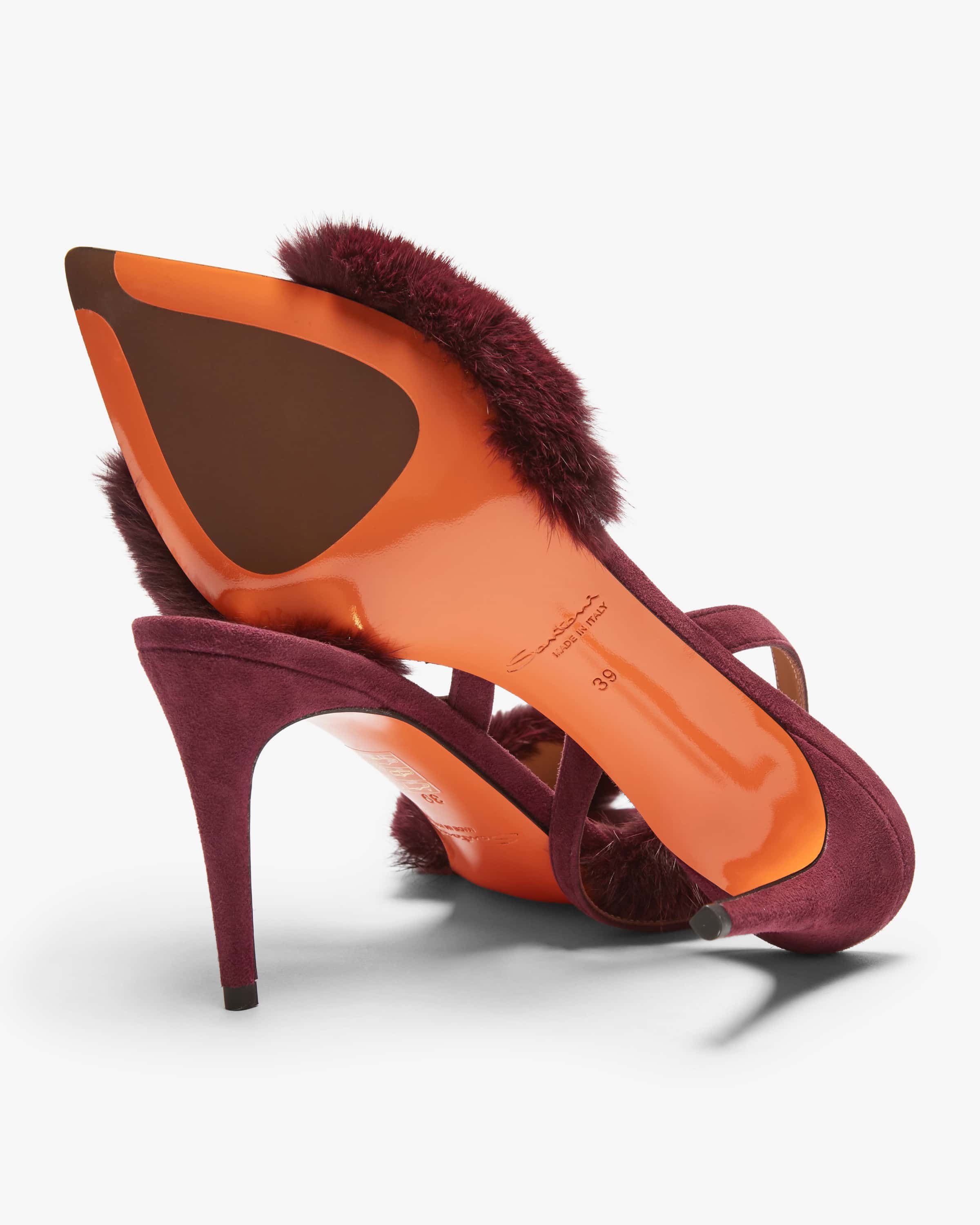 Charlotte Sandaletten für Damen von Santoni in Wine. Die italienische Luxusmarke steht für handgefertigte Schuhe mit makelloser Verarbeitung und edlem Finish. Ein filigraner Eyecatcher für besondere Anlässe - Das feminine High Heel-Modell zeichnet sich durch die Suede-Qualität sowie den Pelzbesetzten-Riemen aus, während die hohe Form mit elastischen Knöchelriemen für einen optimalen Halt sorgt.
