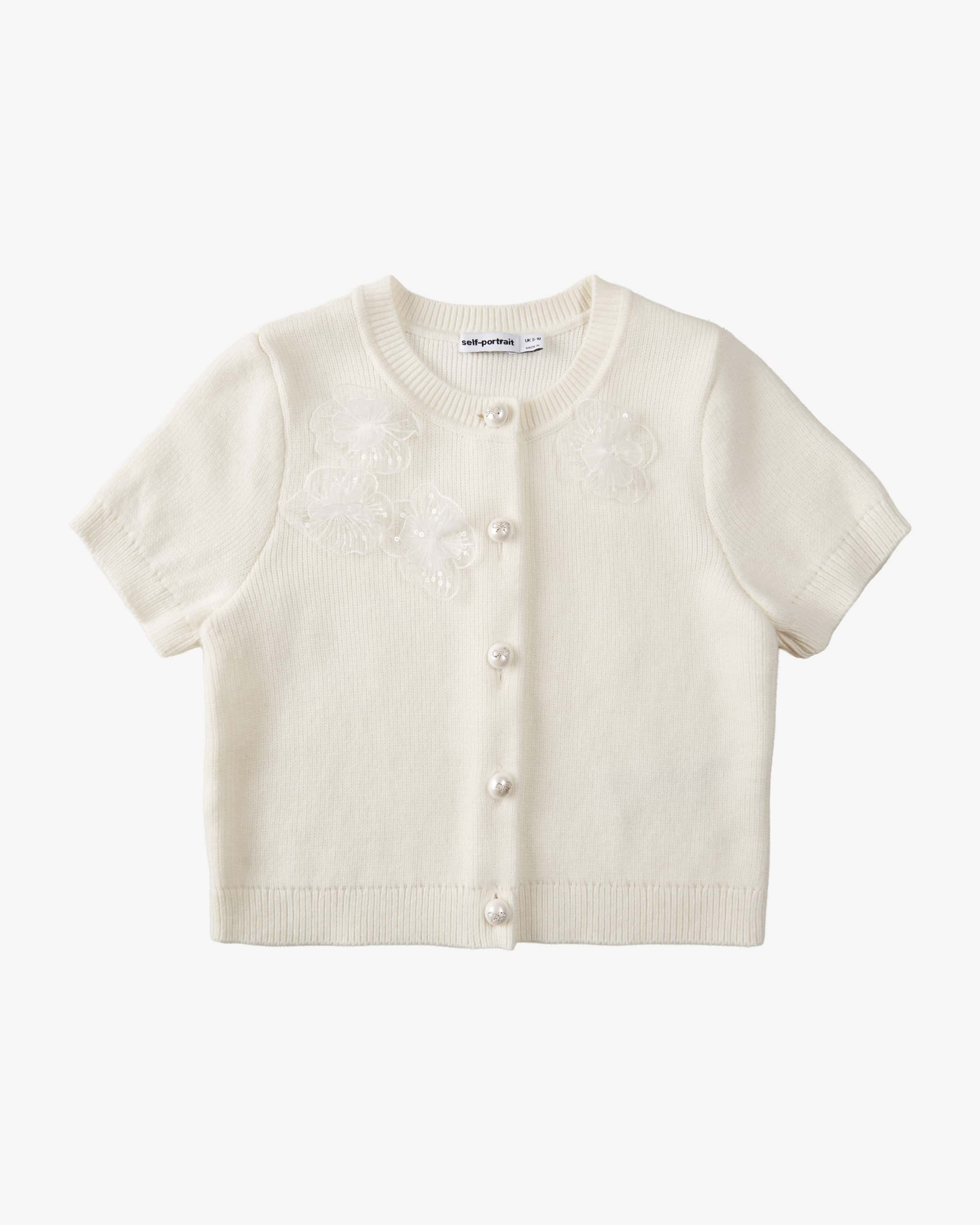 Stickweste für Mädchen von Self-Portrait Kids in Creme. Die Londoner Marke bringt ihren eleganten Stil nun auch in die Kindermode – verspielt, mädchenhaft, besonders. Das Modell in angenehmer Haptik überzeugt mit niedlicher Aufmachung, während die Kugelknöpfe und Blumen-Applikation für optische Akzente sorgen. Perfekt für modische Layering-Outfits.