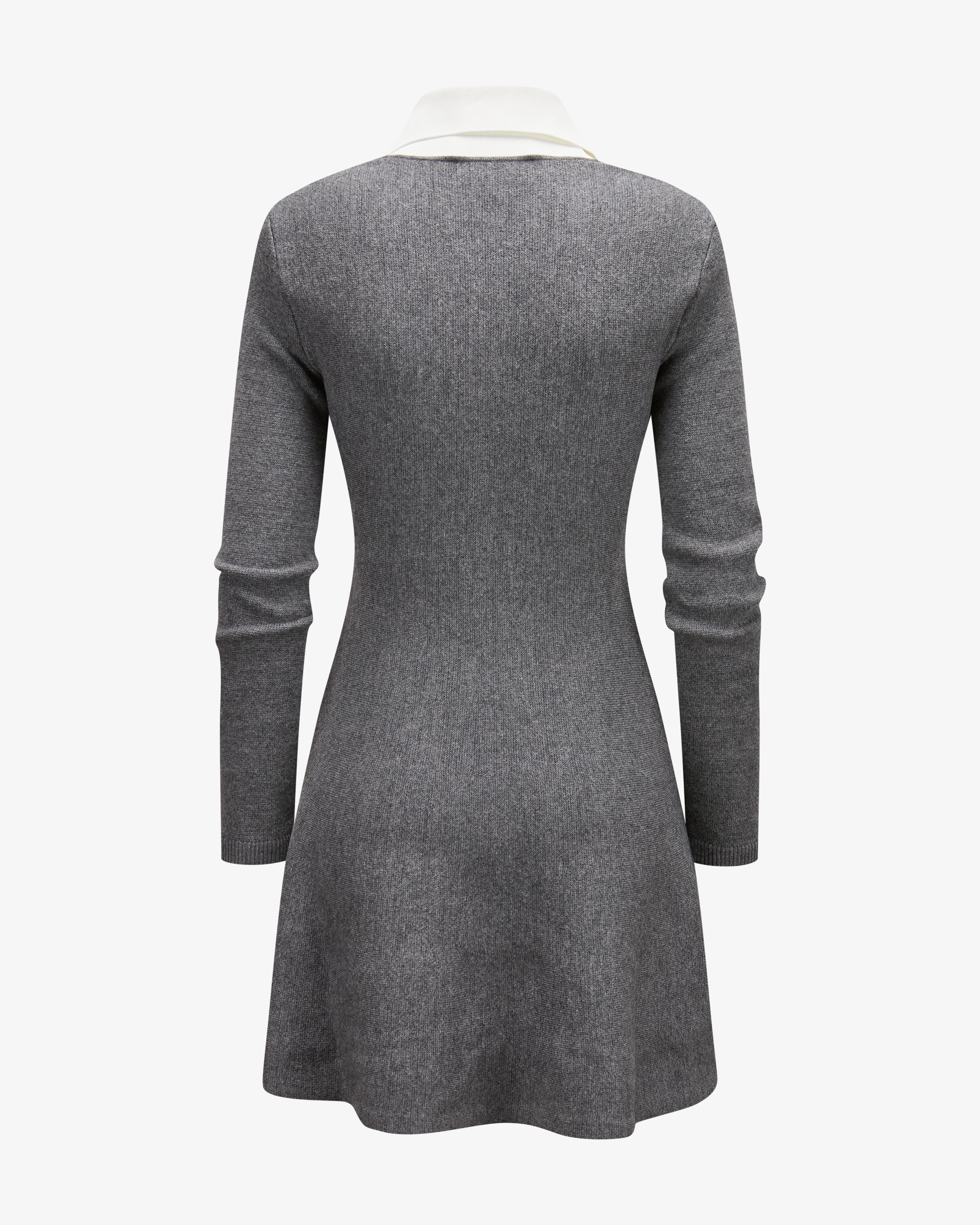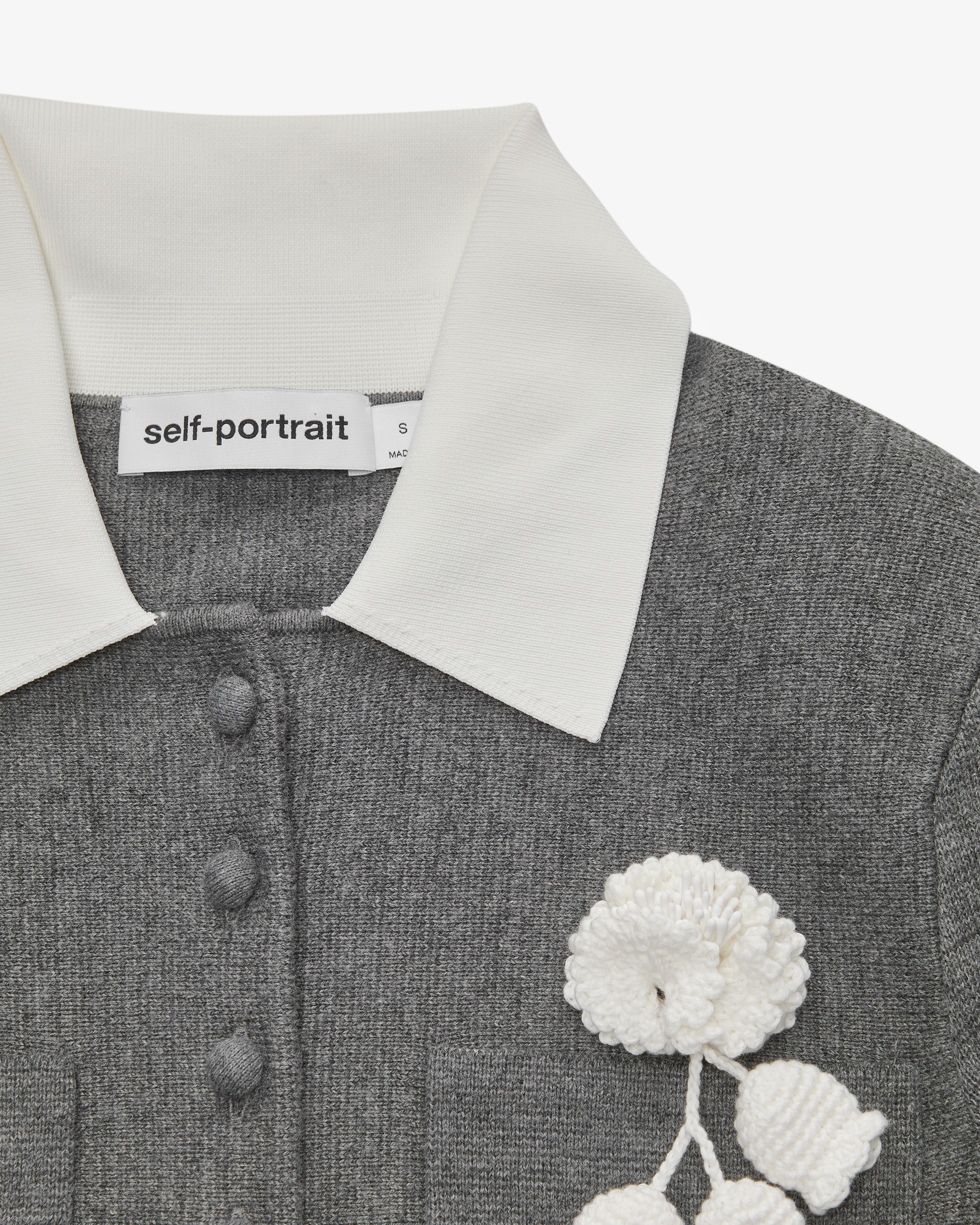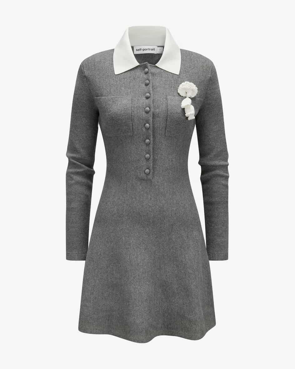 Strickkleid für Damen von Self-Portrait in Grau und Weiß. Das Londoner Label steht für moderne Cocktailkleider mit Spitze, Cut-Outs und femininer Detailverliebtheit. Auch dieses Modell begeistert mit weicher Strick- Verarbeitung, die für angenehmen Tragekomfort sorgt. Klassische Hemdblusen- Details und die florale Häkel-Brosche runden den femininen Look gekonnt ab.