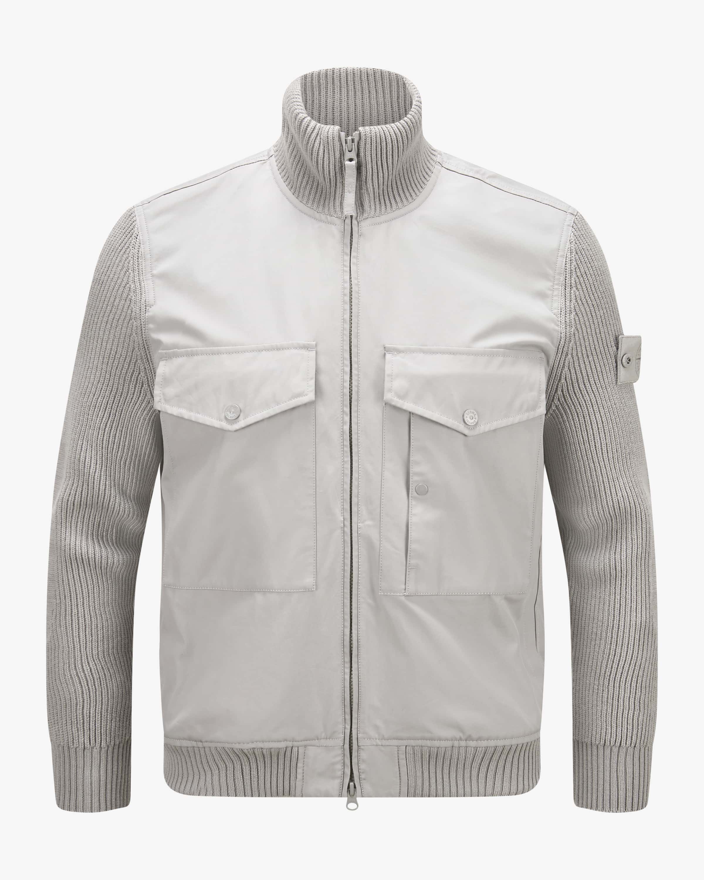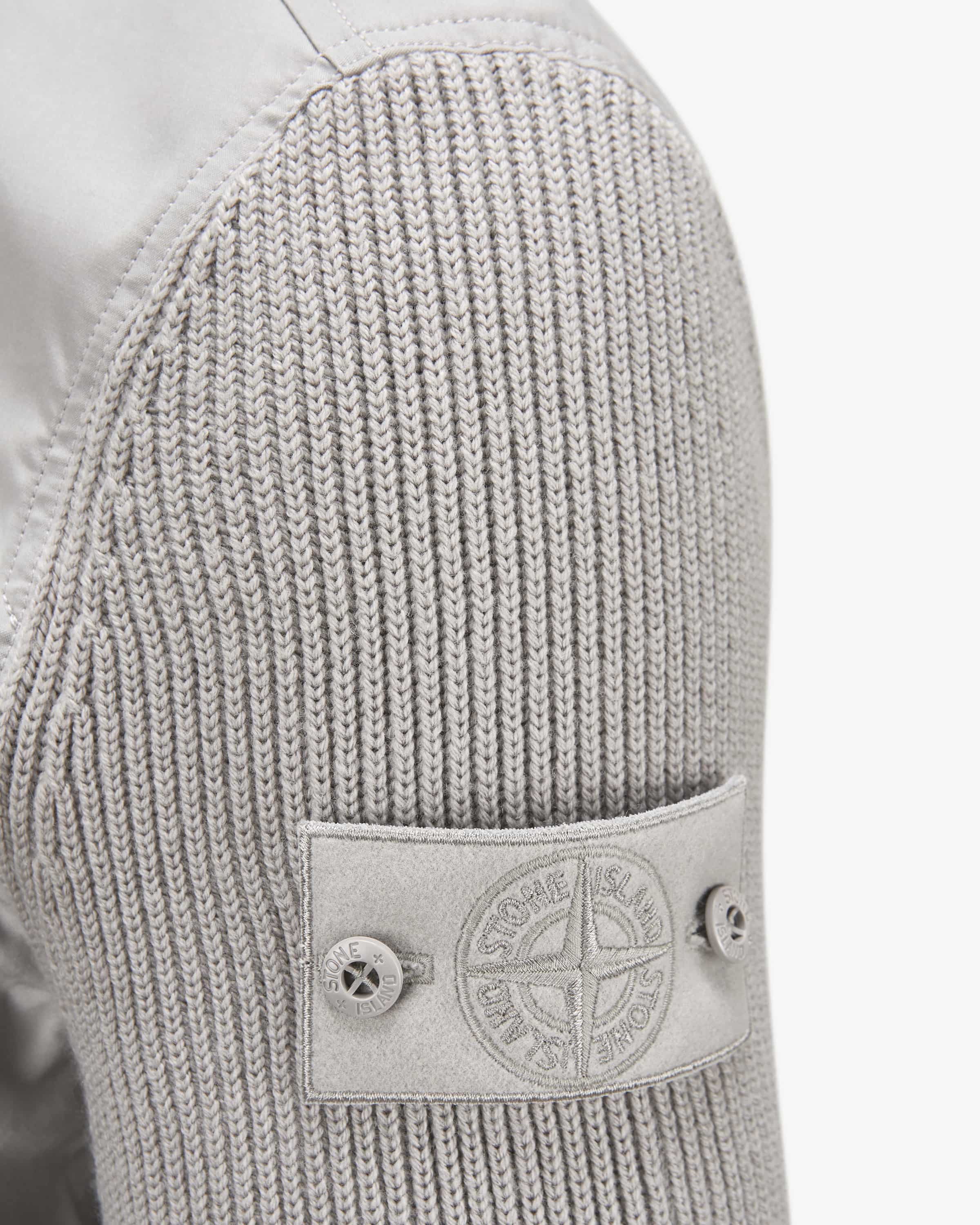 Ghost Piece Hybrid-Blouson für Herren von Stone Island in Grau. Die Ghost Pieces von Stone Island präsentieren sich in einer einheitlichen Farbgebung und tragen das charakteristische Badge, das perfekt zur Farbe des jeweiligen Designs passt. Dieses Modell überzeugt mit raffiniertem Material-Mix mit Strickärmeln, wodurch ein sportiver Übergangs-Begleiter entsteht.