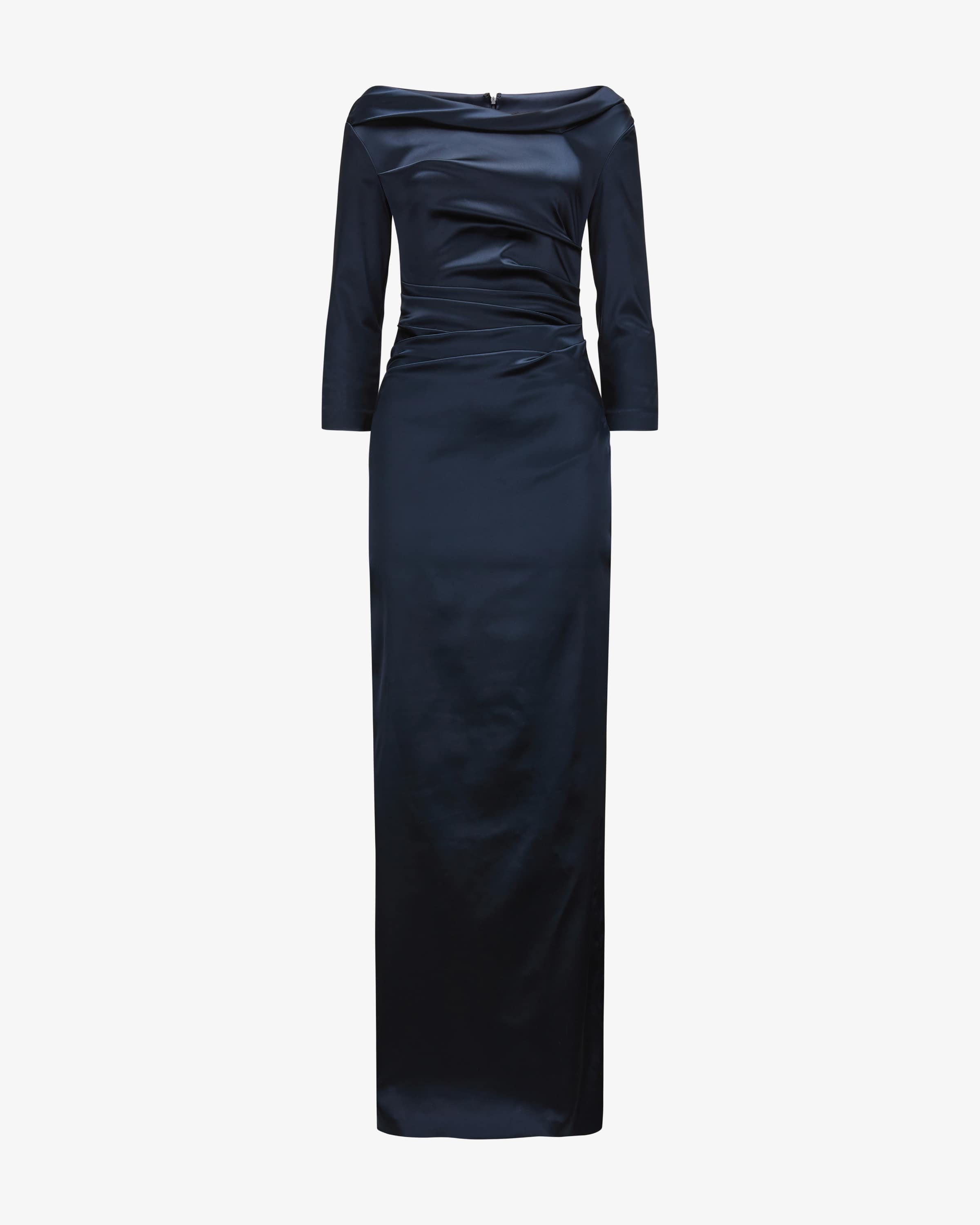 Abendkleid für Damen von Talbot Runhof in Navy. Feminine Raffinesse gepaart mit meisterhafter Schneiderkunst - Das deutsche Designer-Duo Adrian Runhof und Johnny Talbot schafft Mode, in der sich Frauen zu jeder Zeit wohl und schön fühlen sollen. Auch dieses Modell begeistert mit femininer Silhouette mit extravagantem Ausschnitt und schmaler Passform mit geraffter Taille, während die changierende Satin-Verarbeitung einen edlen Begleiter für festliche und elegante Anlässe schafft.