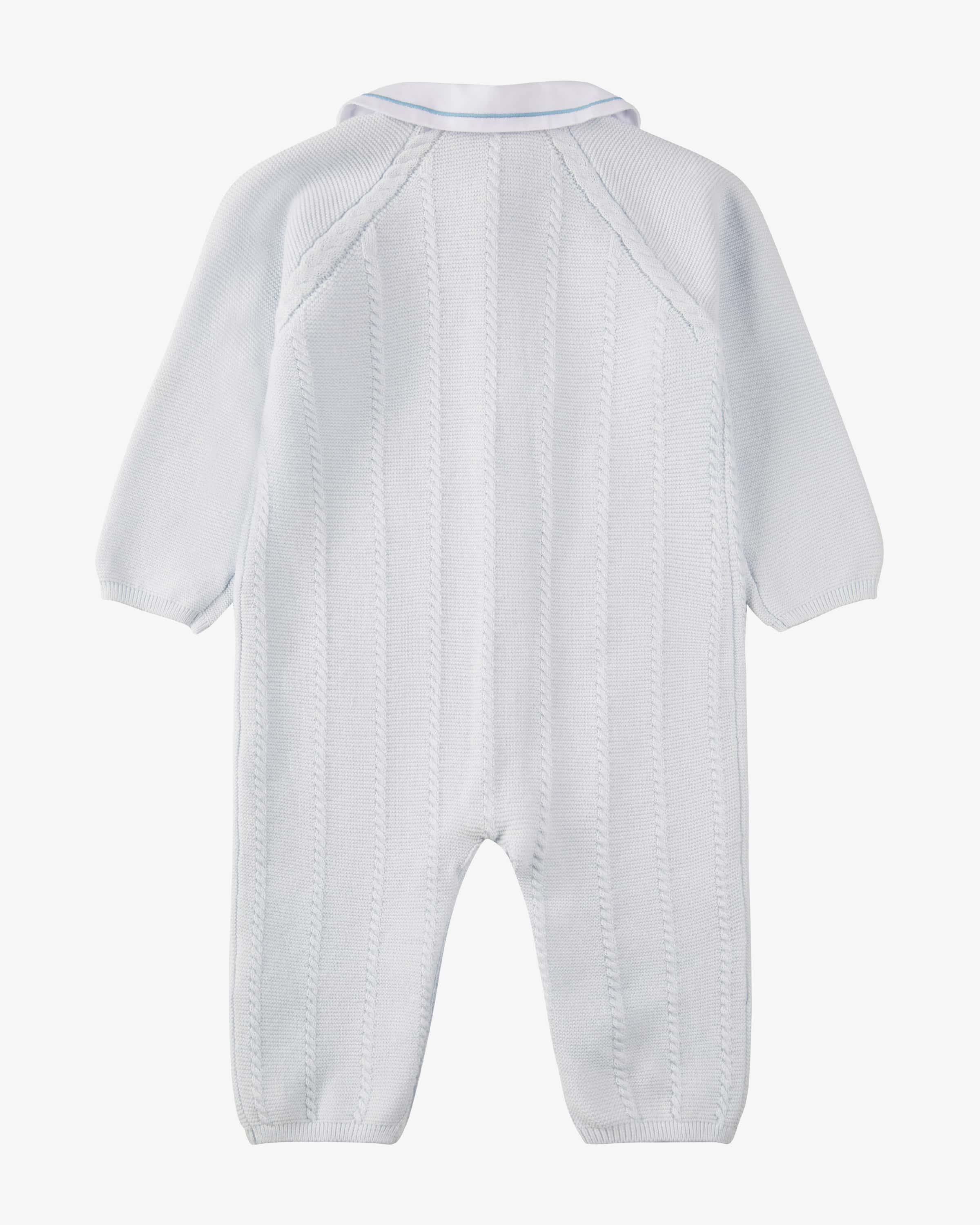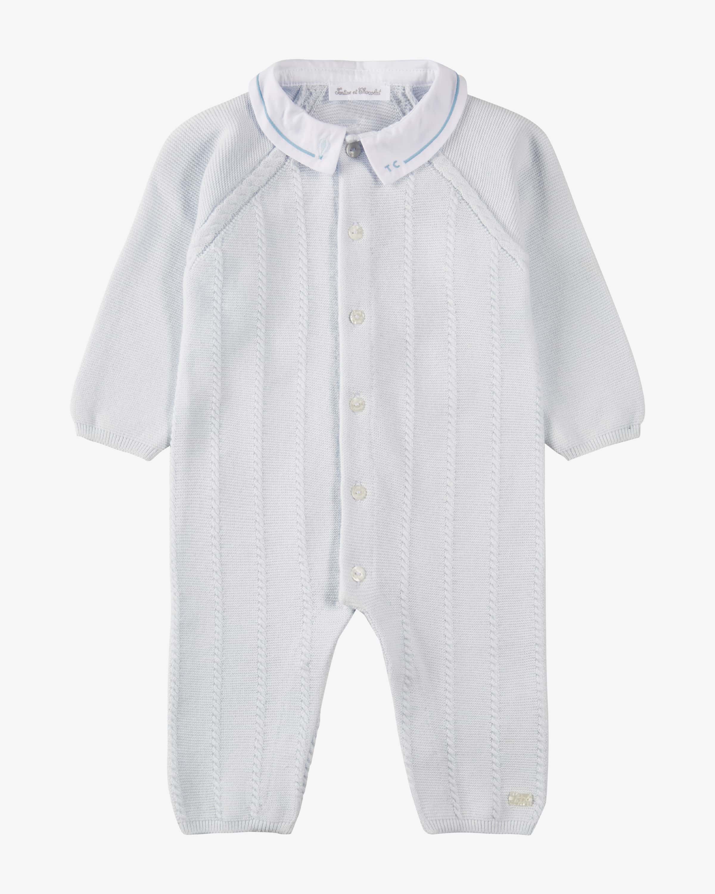 Strick-Overall für Babys von Tartine et Chocolat in Hellblau und Weiß. Französische Kindermode - Pariser Chic für die Kleinsten. Dieses Modell überzeugt mit angenehmer Baumwoll-Qualität, während das hochwertige Strick- Design mit Zopf-Elementen den niedlichen Gesamtlook gekonnt inszeniert. Der glatte Kragen verleiht zudem den letzten Schliff.