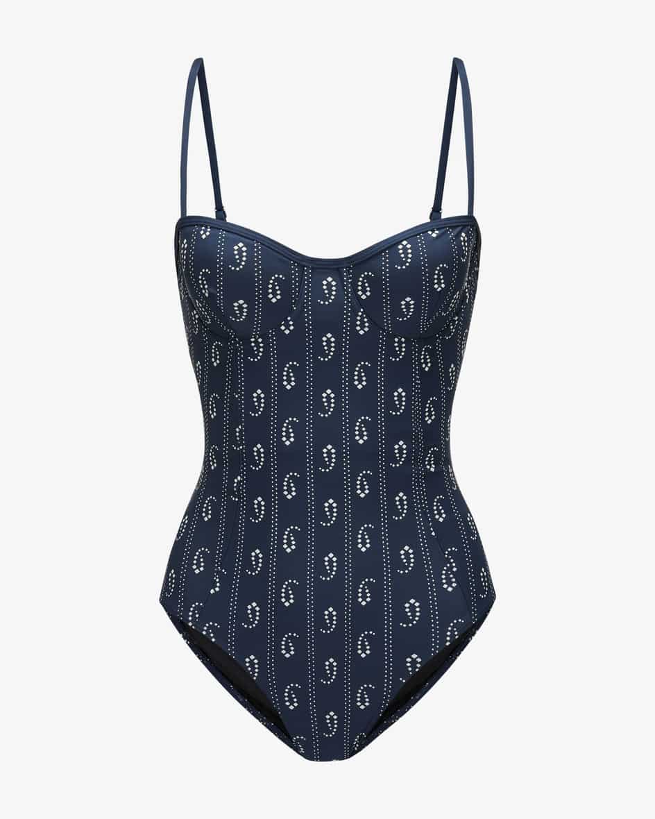 Badeanzug für Damen von Tory Burch in Navy und Weiß. Das Modell avanciert dank geometrischem Allover-Muster zu einem modernen Bade-Favoriten, welcher durch die feminine Aufmachung mit gepolsterten Cups gekonnt vollendet wird.