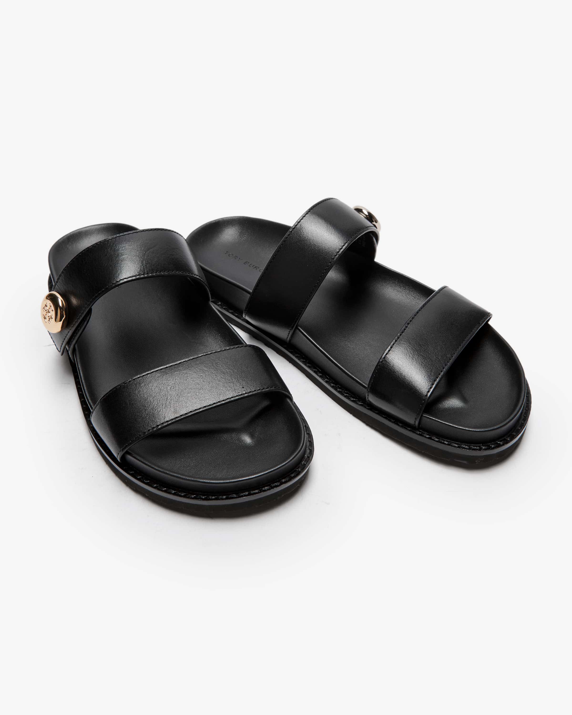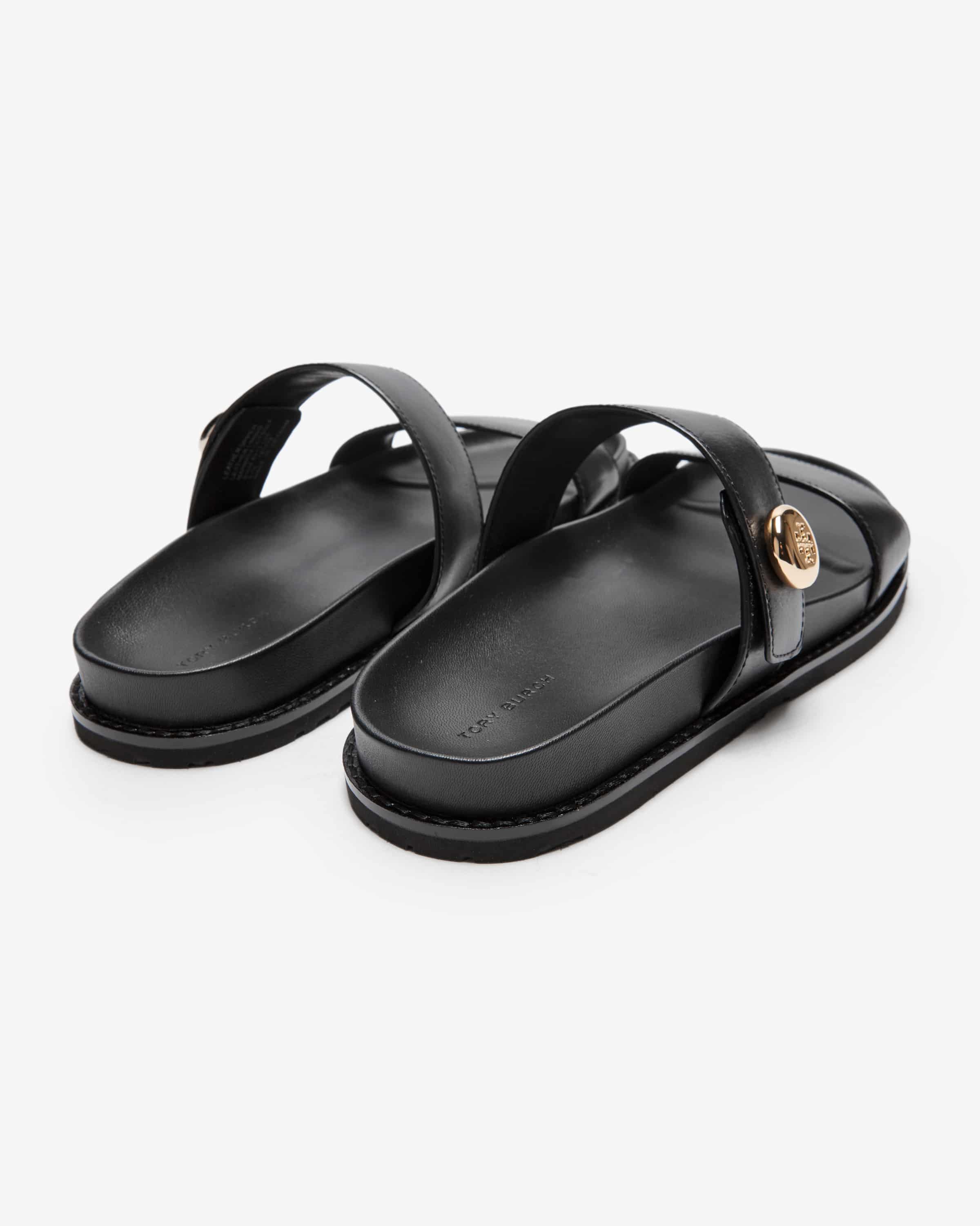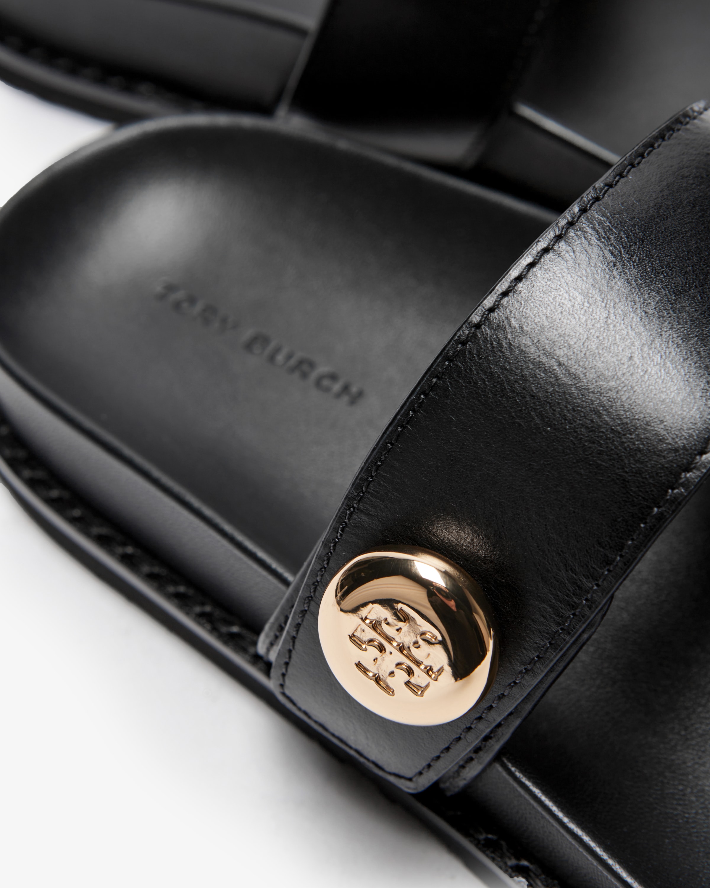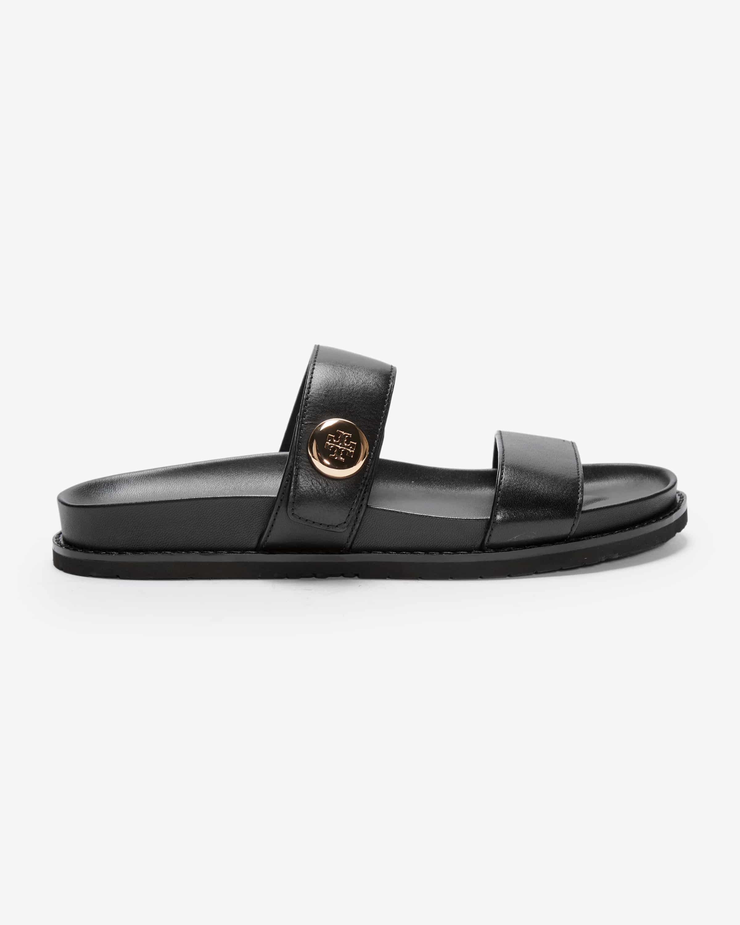 Pantolette Romy Sport Slide für Damen von Tory Burch in Schwarz. Die amerikanische Marke steht für Preppy-Luxus mit Boho-Einflüssen. Auch dieses Modell aus hochwertigem Rindsleder überzeugt mit breiten Riemen, während die goldfarbene Logo-Applikation den sommerlichen Begleiter stilvoll abrundet.