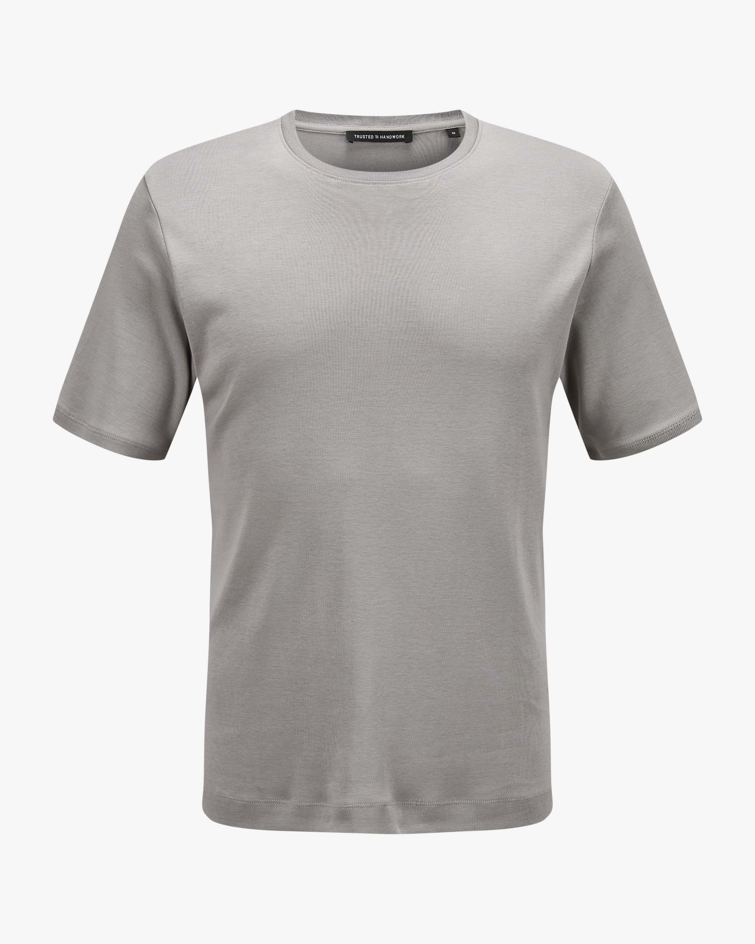T-Shirt für Herren von Trusted Handwork in Grau. Mit Liebe und Leidenschaft designt das Label nachhaltig produzierte, handgefertigte Kleidung. Das Modell begeistert dank der Verwendung von softer Pima-Baumwolle in fein gerippter Aufmachung als hochwertiges Basic für vielseitige Casual-Looks.
