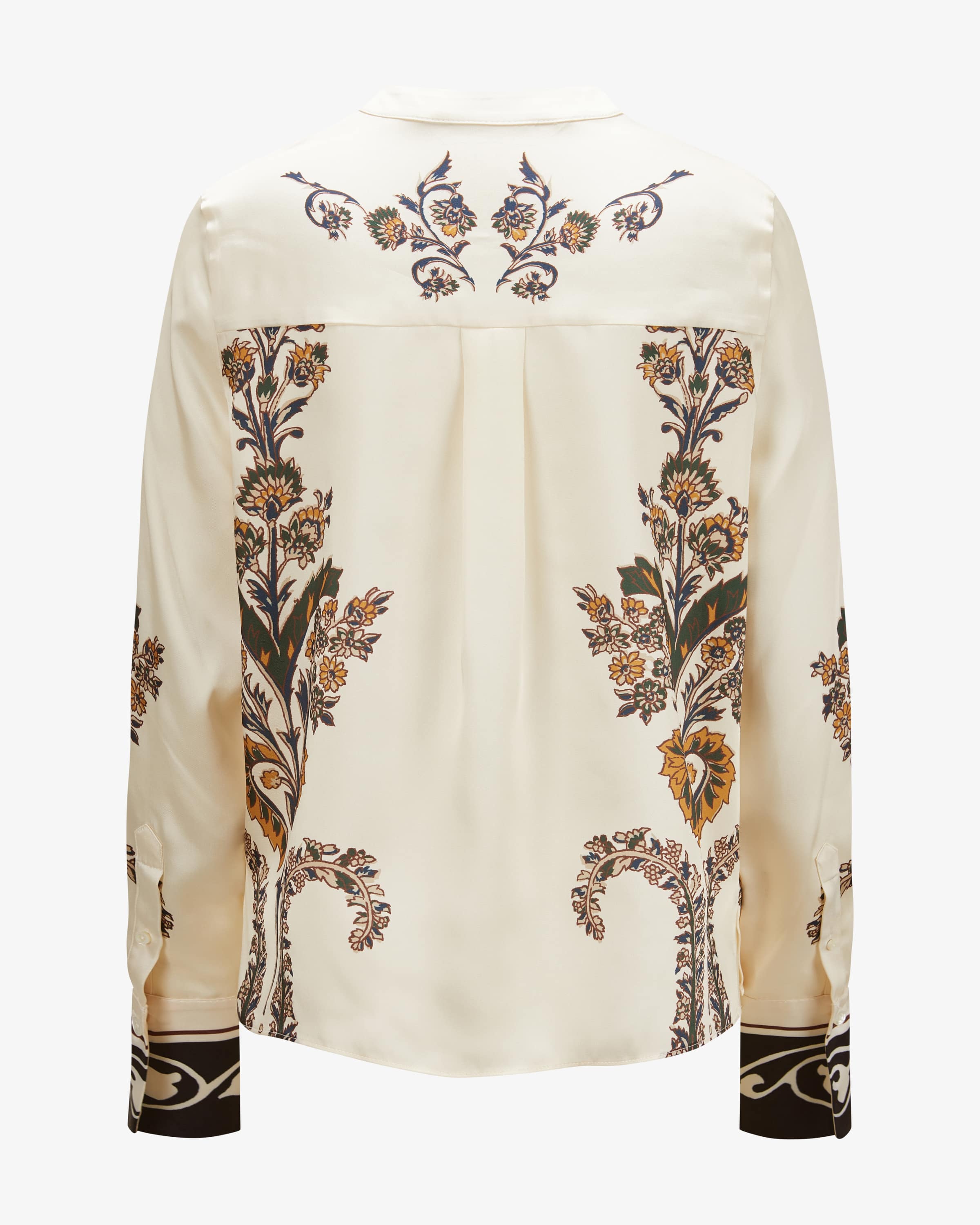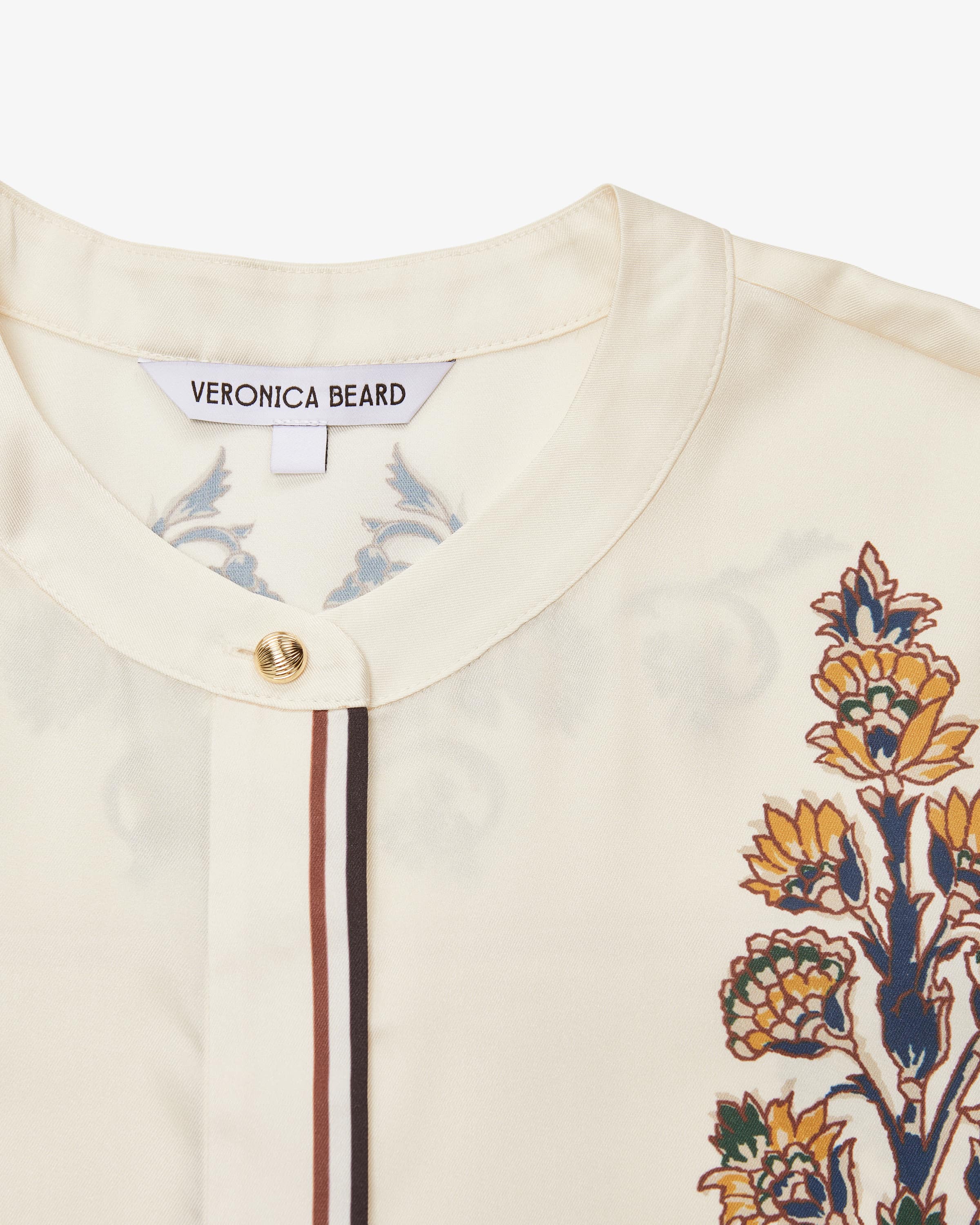 Bluse Hoku für Damen von Veronica Beard in Ecru, Dunkelblau und Braun. Das New Yorker Label kreiert clevere Power-Looks mit femininer Note - perfekt für Business & Beyond. Auch dieses Modell begeistert mit floralem Print im femininen Boho-Look, während klassische Details und das dezent changierende Material den Look gekonnt ergänzen.