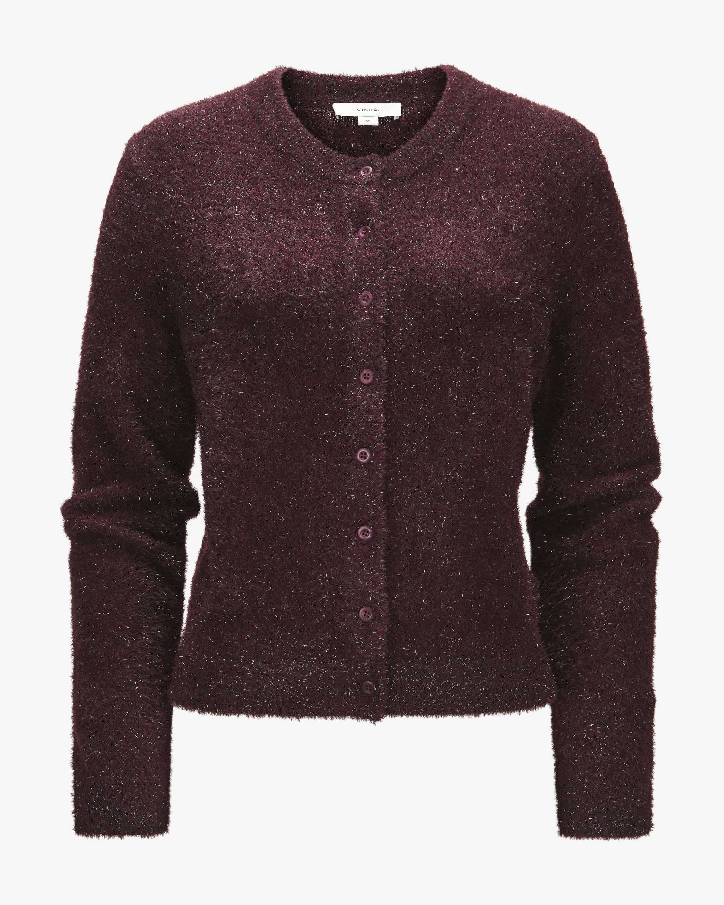 Strickjacke für Damen von Vince in Bordeaux. Das kalifornische Label steht für relaxed Luxury – edle Basics, weiche Stoffe und klare Schnitte. Auch dieses Modell in winterlicher Optik und kuscheligem Material-Mix überzeugt mit changierenden Glitzerfasern in extravaganter Aufmachung.