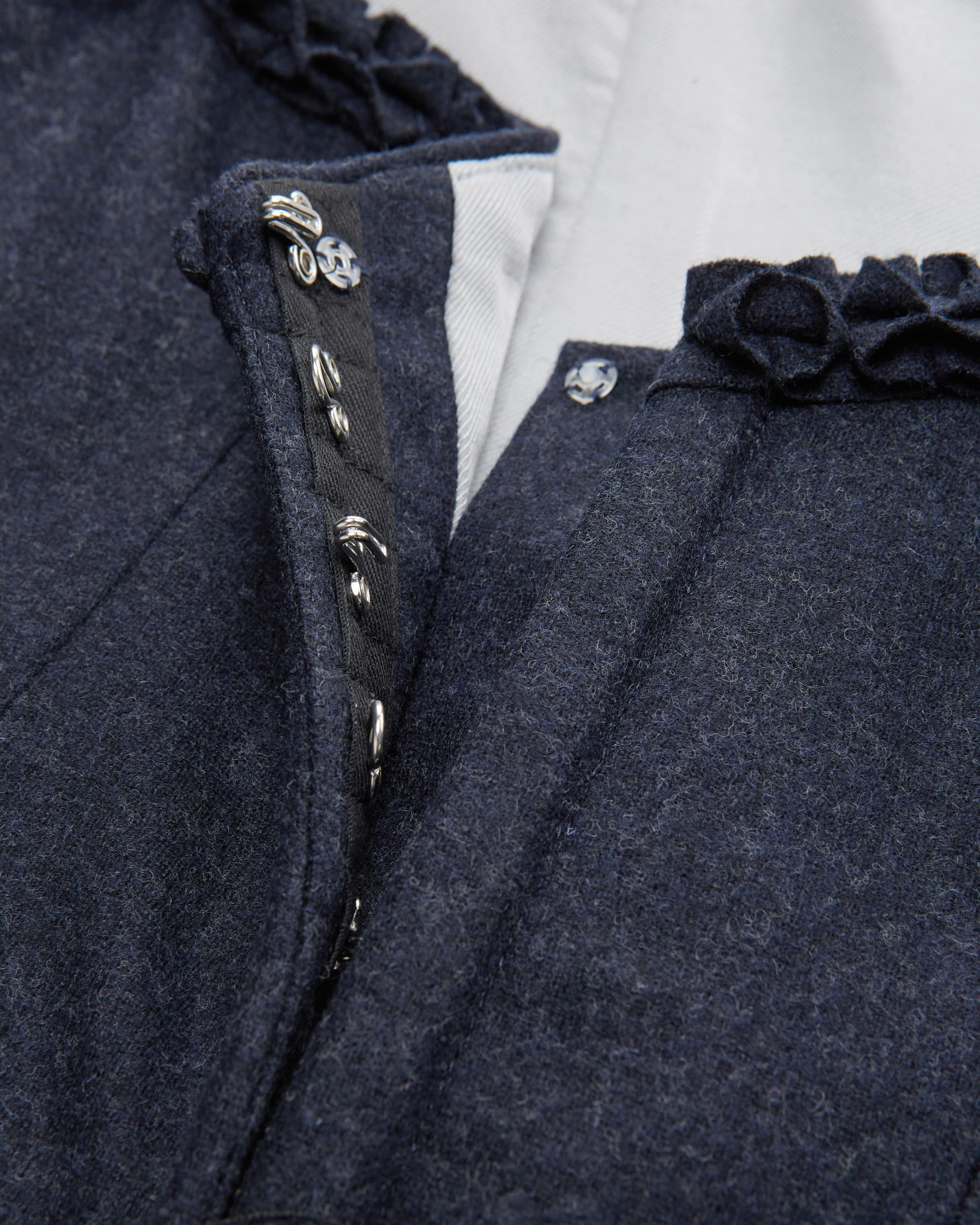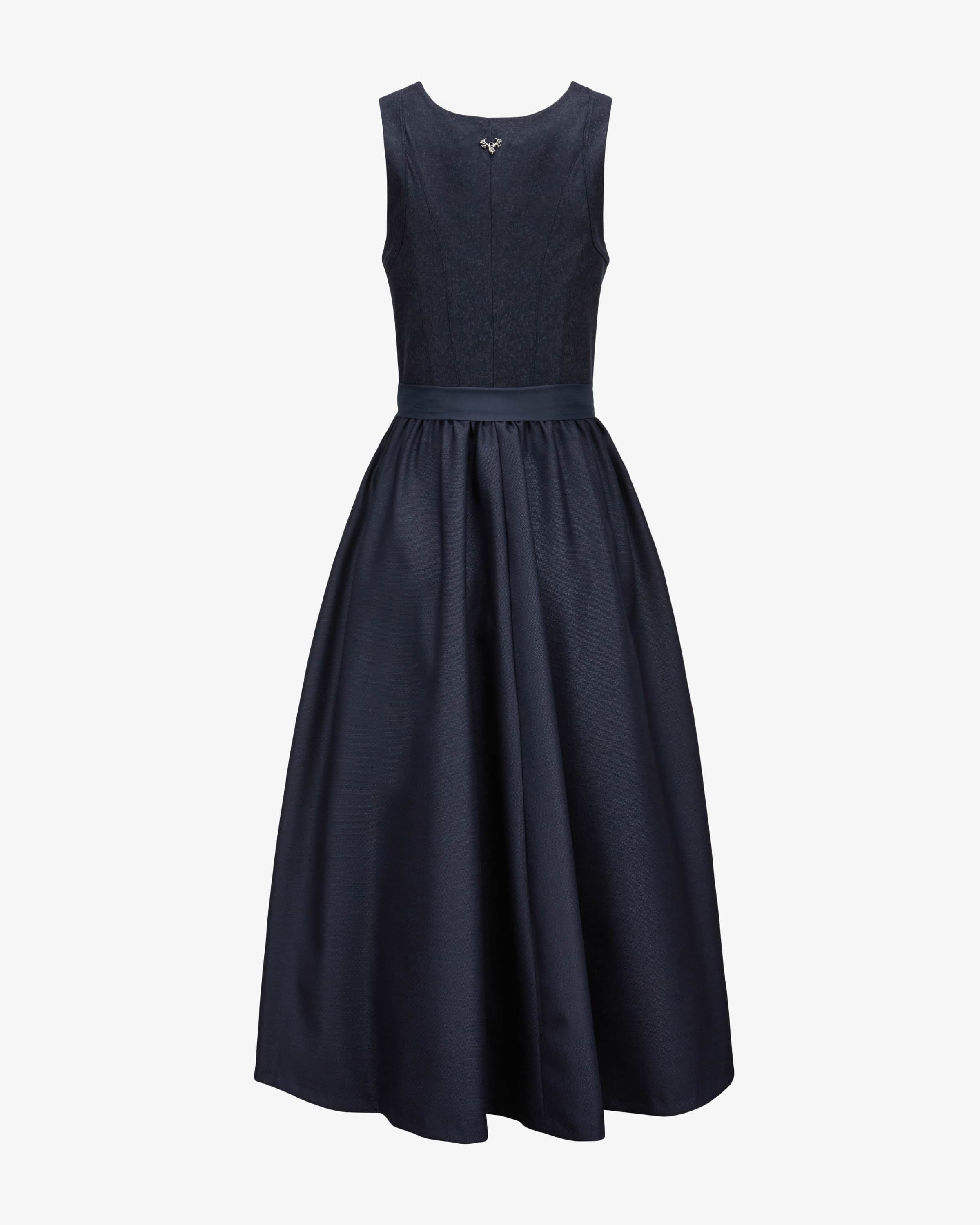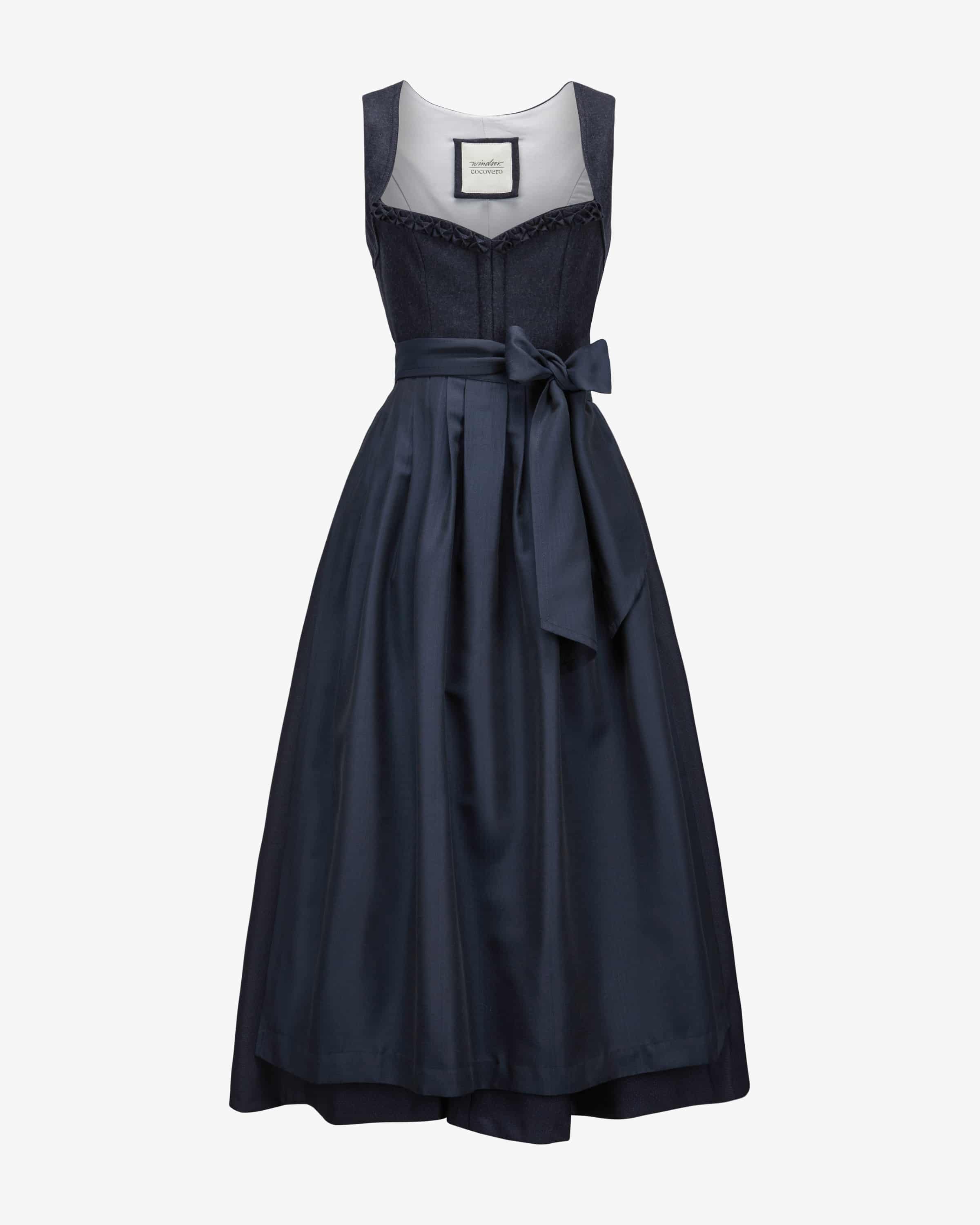 Annelie Woll-Dirndl lang mit Schürze für Damen von Windsor in Navy. Das Modell punktet dank hochwertiger Woll-Qualität und fein gemustertem Rock in femininer Aufmachung, während tonige Froschgoscherl-Borten den traditionellen Charakter stilvoll untermalen. Zugleich vollendet die dezent changierende Schürze mit Streifenmuster den Trachten-Look gekonnt.