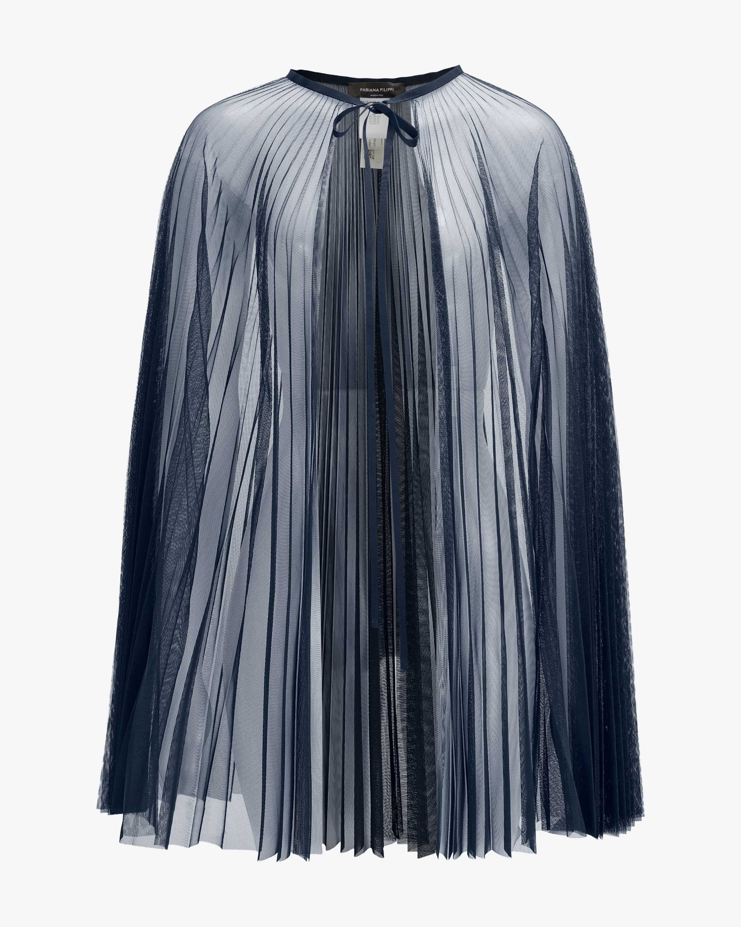 Tulle cape for women from Fabiana Filippi in navy. The Italian brand stands for for modern elegance, high-quality materials and subtle colors. The wide model becomes a feminine layering highlight thanks to the transparent tulle layering highlight, while the laced neckline skilfully completes this special accessory. skilfully completes this special accessory.