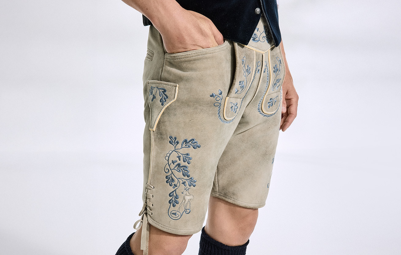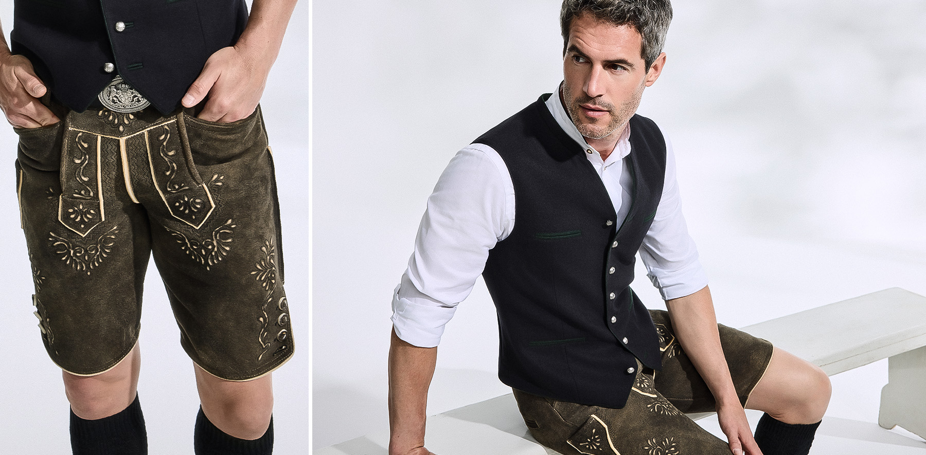 It's finally time again: discover the four new Oktoberfest lederhosen from LODENFREY. The short styles are made from fine goatskin and feature traditional embroidery in fashionable colors. Light natural tones such as beige and brown give the traditional costume a fresh touch. Complete the traditional look with traditional shirts, vests, socks and Haferl shoes.