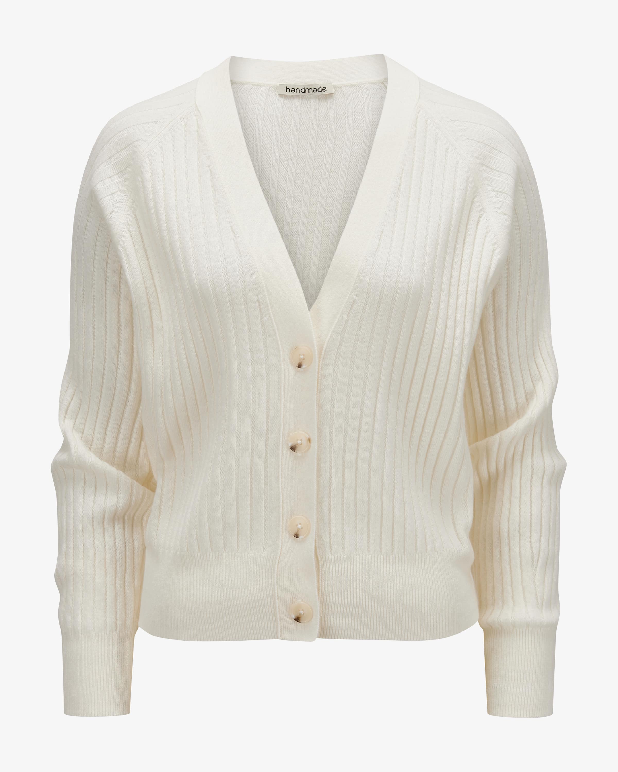 Strickjacke für Damen von handmade in Ecru. Das Modell besticht als Casual Favorit mit vielseitigen Kombinationsmöglichkeiten dank der klassischen Schnittführung, während das Rippstrick-Dessin im Woll-Cashmere-Mix einen sportiven Touch verleiht.